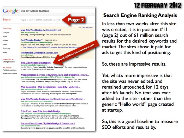 Search Engine Ranking Analysis. In less than two weeks, by 12 February 2012, the site had reached position #11 for the desired keywords and market (as explained below) — without having invested any time in the site during or since launch. In the months ahead, some organic promotion and SEO efforts will be made to give the site better exposure.